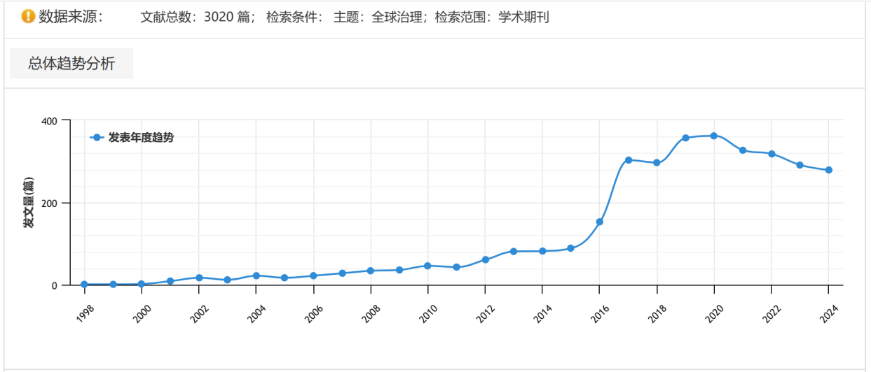图1 全球治理相关文献发表时间分布图 (数据来源:中国知网CNKI获取;获取时间:2024年1月15日)