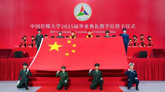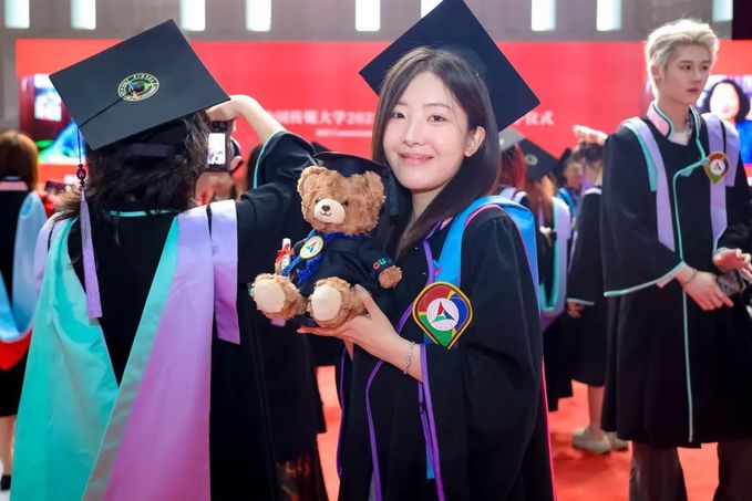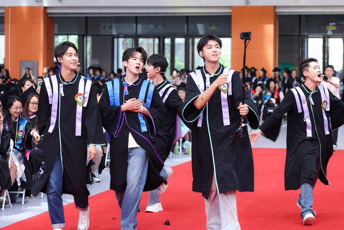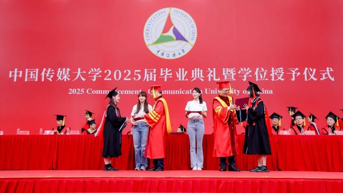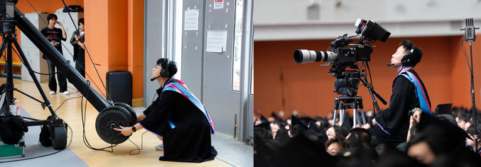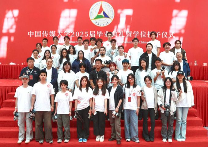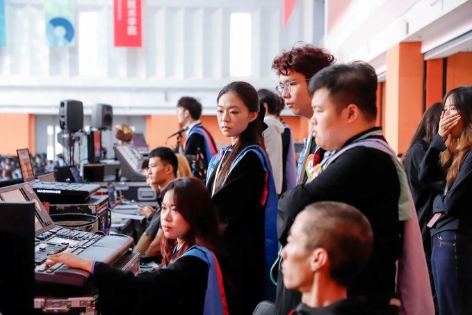 本次毕业典礼是一堂多专业联合实践的沉浸式课堂,策划、设计、导演、摄像、直播、宣推等工作均由在校师生承担,体现了我校师生在媒体融合领域的专业素养。戏剧影视学院的教师带领摄影专业的同学们,为每一位毕业生拍下学位授予的珍贵瞬间。
