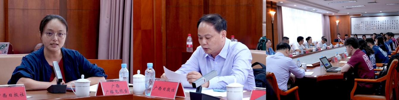 6月20日,广西壮族自治区党委宣传部副部长、自治区人民政府新闻办公室主任黎攀及自治区相关单位负责人为国新班师生介绍广西区情及国际传播工作等相关情况。黎攀首先对国新班师生一行的到来表示欢迎,对同学们在未来调研中的成果与收获表示期待。他从广西经济社会发展的基本情况出发,围绕经济发展势头、人工智能发展、国际传播、文化出海及青少年教育等方面介绍了新时代壮美广西解放思想、创新求变,向海图强、开放发展的探索实践。黎攀表示,和同学们的交流让他充分感受到了正能量青春带来的蓬勃生命力,令他振奋,更令他感动。希望同学们能够在此次调研中深入了解广西、真正爱上广西,祝愿大家调研顺利、收获满满。