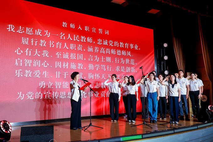 新入职教职工在退休教授高慧燃的带领下庄严宣誓,承诺接续奋斗、不负使命,体现了918博天堂教师精神在新时代的薪火相传。